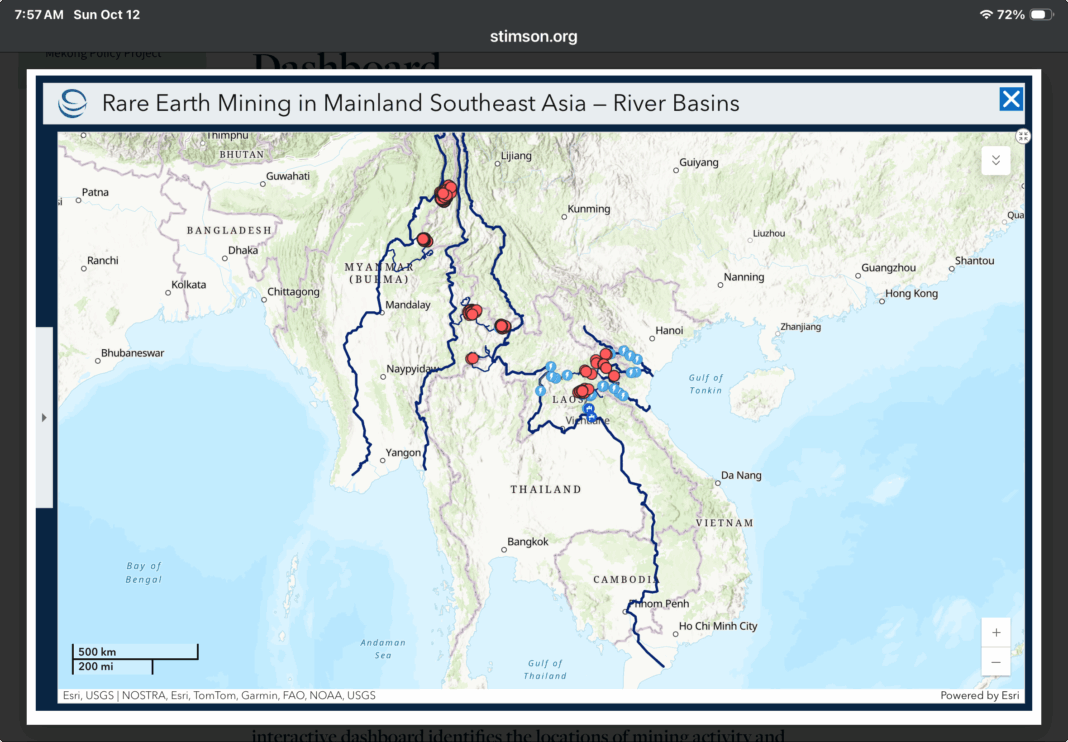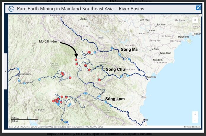 Trung tâm Stimson đã lập một bản đồ tương tác định vị các mỏ đất hiếm ở Đông Nam Á, nhiều mỏ trong số đó do các công ty Trung Quốc vận hành. Tại Lào, ít nhất 12 mỏ nằm gần thượng nguồn các sông Mã, sông Chu và sông Lam. Các hoạt động này đe dọa trực tiếp đến Việt Nam, vì các con sông chảy từ Lào vào các tỉnh đông dân của Việt Nam.