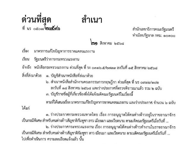 Ngày 19 tháng 8, Nội Các Thái Lan thông qua nghị quyết chấp thuận đề xuất của Bộ Lao Động và các khuyến nghị của Bộ Nội Vụ nhằm giải quyết tình trạng thiếu hụt lao động vì: (1) hàng trăm nghìn người lao động Cambodia hồi hương do xung đột biên giới giữa 2 quốc gia, và (2) nhiều người lao động Miến Điện không quay lại Thái Lan được do nội chiến. Xem: toàn văn nghị quyết trong tiếng Việt và tiếng Anh tại đây: https://dvov.org/wp-content/uploads/2025/10/Cabinet-Resolution-19-August-2025.pdf