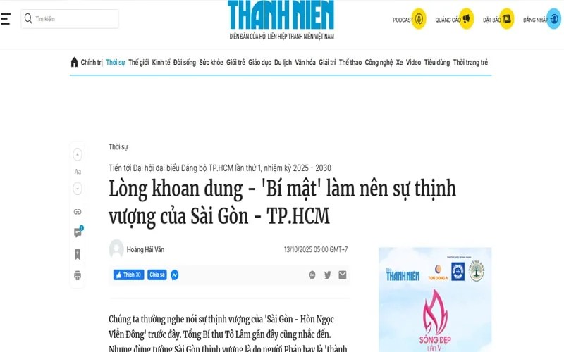 Ngày 13 tháng 10, báo Thanh Niên đăng bài “Lòng Khoan dung- ‘bí mật’ làm nên sự thịnh vượng của Sài Gòn-TP.HCM.” (*)