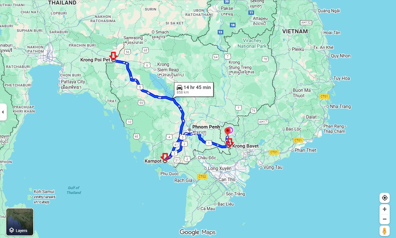 (Hai cái tên Kampot và Bavet xuất hiện khá nhiều lần khi chúng tôi phỏng vấn các nạn nhân Việt Nam bị lừa hoặc bắt cóc sang Campuchia; có hai nạn nhân ở Poipet không giải cứu được).