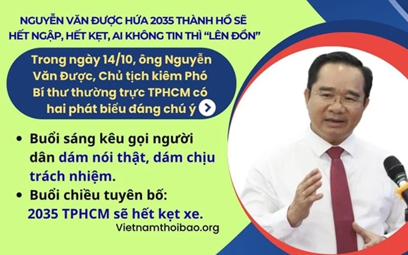 Trong ngày 14/10, ông Nguyễn Văn Được, Chủ tịch kiêm Phó Bí thư thường trực Thành Hồ có hai phát biểu đáng chú ý. Một là kêu gọi người dân dám nói thật, dám chịu trách nhiệm. Hai là tuyên bố 2035 TPHCM sẽ hết kẹt xe.