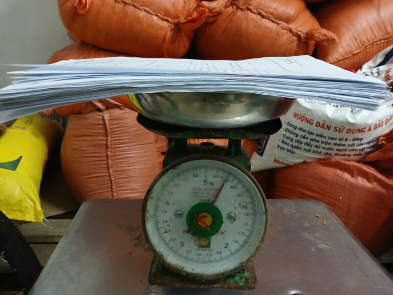 Tôi cầm tập giấy, đếm, 75 tờ, nghĩa là khoảng 150 trang, phải chụp 150 bức ảnh để “đẩy lên” Dịch vụ công. Nhân tiện có cái cân đồng hồ nhỏ bên cạnh, tôi đặt lên xem thử, 400gr (4 lạng), gần nửa cân giấy.