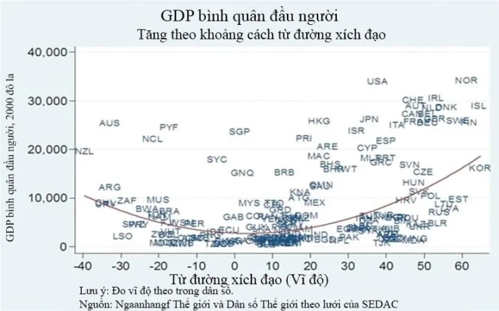 Biểu đồ dưới đây cho thấy quốc gia gần xích đạo thường nghèo hơn, với GDP bình quân đầu người thấp hơn đáng kể so với vùng ôn đới.