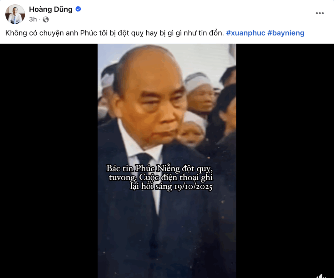 Facebooker Hoàng Dũng, người thạo tin về chính trường Việt Nam, cho biết ý kiến về tin đồn ông Phúc “bị đột quỵ”: “Nguyễn Xuân Phúc bây giờ không còn là mối quan tâm của tôi, ông ta không còn quan trọng nữa nên việc đột quỵ hay [qua đời] là không được quan tâm. Tuy nhiên, cuối cùng, vẫn cứ phải nhờ một người anh em khác xác nhận rằng Nguyễn Xuân Phúc vẫn còn khoẻ mạnh bình thường. Như nội dung cuộc điện thoại vừa nghe.”