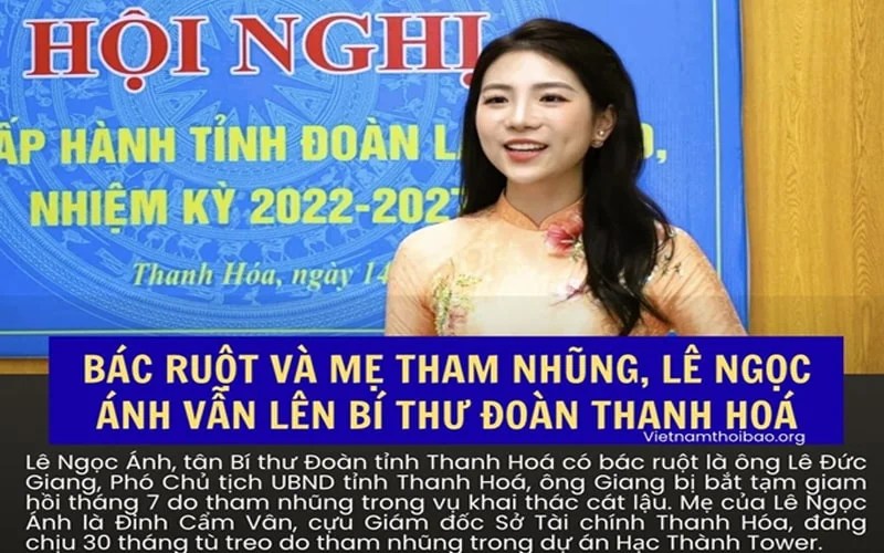 Trung tuần tháng 10, Lê Ngọc Ánh, sinh năm 1994, trở thành nữ tân Bí thư Tỉnh đoàn với 100% số phiếu đồng ý. Đây cũng là Tỉnh ủy viên trẻ nhất tỉnh Thanh Hóa nhiệm kỳ 2025-2030. Điều này đúng ra là dấu hiệu mừng vì cán bộ được trẻ hoá, tuy nhiên, đối với chế độ độc tài cộng sản thì lại khác. Bởi, tìm hiểu gia thế tân Bí thư này thì hoá ra lại là con ông cháu cha được “cơ cấu”.