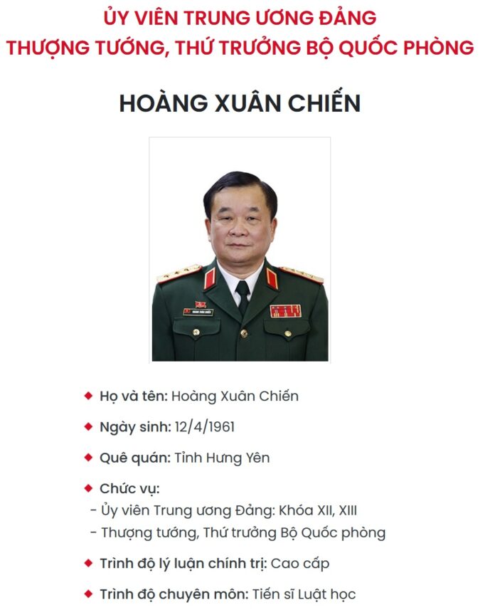 Theo website của Đảng CSVN, Thượng tướng Hoàng Xuân Chiến còn là Ủy viên Trung ương đảng hai khóa 12 và 13, Ủy viên thường vụ Quân ủy Trung Ương và là Thứ trưởng Bộ Quốc phòng. Thượng tướng Chiến sinh ngày 12 tháng 4 năm 1961 ở Hưng Yên, có trình độ lý luận chính trị cao cấp, trình độ chuyên môn là Tiến sĩ Luật học.