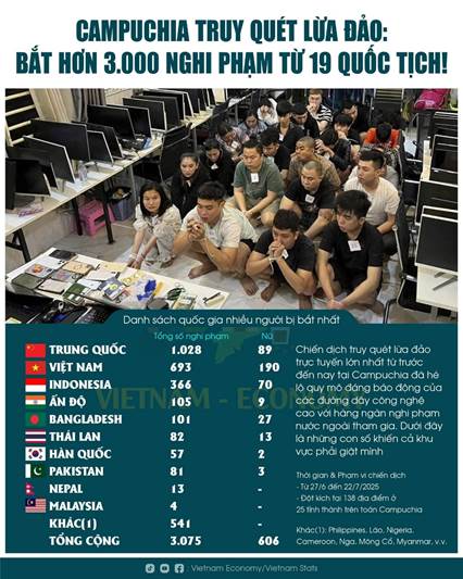Trước áp lực quốc tế, đầu tháng 8 năm nay chính phủ Campuchia cho biết họ đã bắt giữ hơn 3 nghìn nghi phạm trong đó đông nhất là công dân China hơn 1000 người, và kế đến là Việt Nam gần 700 người. Số nghi phạm là công dân các quốc gia khác thấp hơn hẳn: Indonesia 366, Ấn Độ 105, Bangladesh 101, Thái Lan 82…