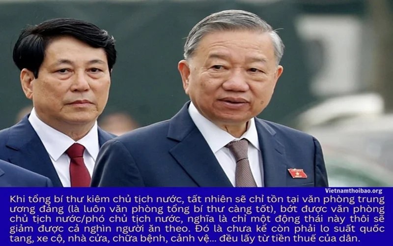 Khi tổng bí thư kiêm chủ tịch nước thì bớt được văn phòng chủ tịch nước/phó chủ tịch nước, nghĩa là chỉ một động thái này thôi sẽ giảm được cả nghìn người ăn theo, chưa kể còn phải lo suất quốc tang, xe cộ, nhà cửa, chữa bệnh, cảnh vệ… đều lấy từ tiền thuế của dân.