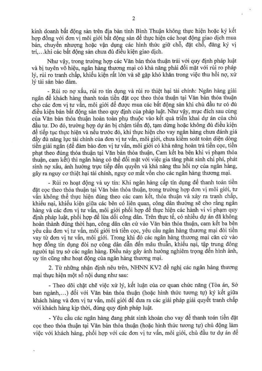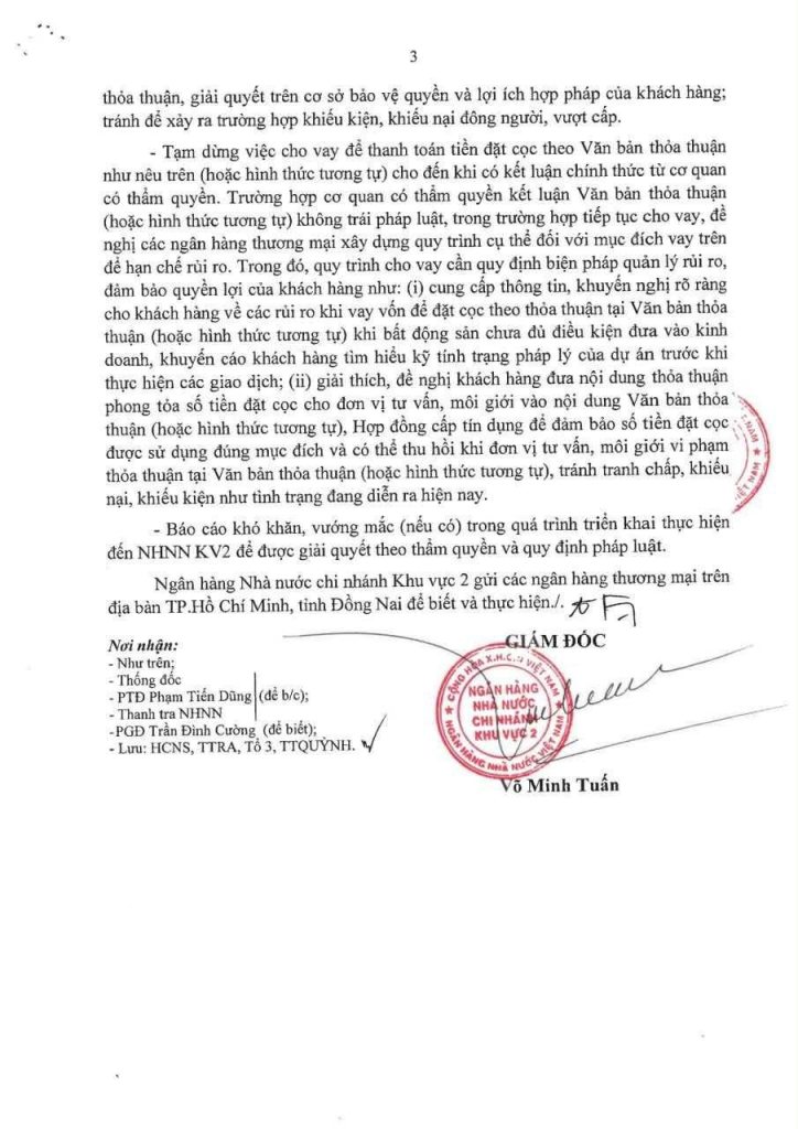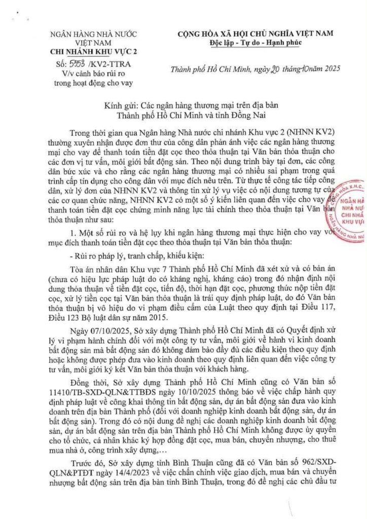 Giữa bối cảnh ấy, chỉ đạo của Ngân hàng Nhà nước Chi nhánh Khu vực 2 xuất hiện hôm 20/10 như một cú phanh gấp cần thiết. Văn bản yêu cầu tạm dừng việc cho vay để thanh toán tiền đặt cọc theo các văn bản thỏa thuận mập mờ, đồng thời rà soát toàn bộ các khoản tín dụng có rủi ro pháp lý tương tự.