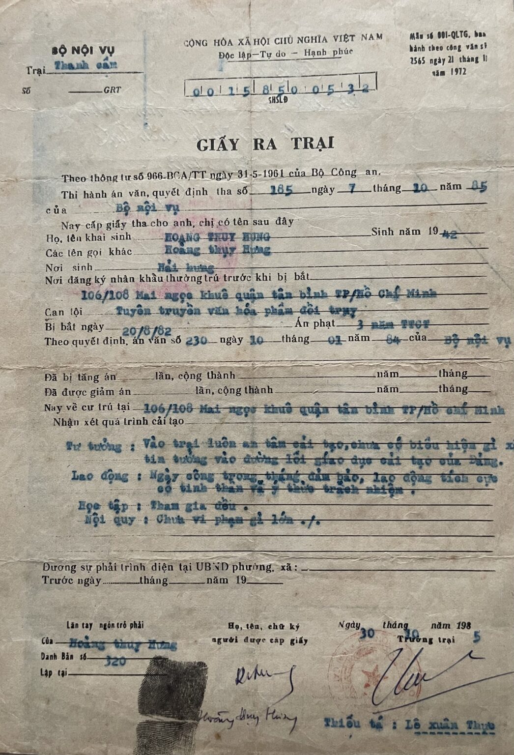 “… Thi hành án văn, quyết định tha số 185 ngày 7 tháng 10 năm 85… Nay cấp giấy tha cho anh, chị có tên sau đây: Hoàng Thuỵ Hưng sinh năm 1942… Can tội: Tuyên truyền văn hoá phẩm đồi truỵ [!!!] Bị bắt ngày 20/8/82 [ngày bị bắt chính xác là 17/8/1982] Án phạt: 3 năm TTCT Theo quyết định, án văn số 230 ngày 30 tháng 1 năm 84 của Bộ nội vụ…”