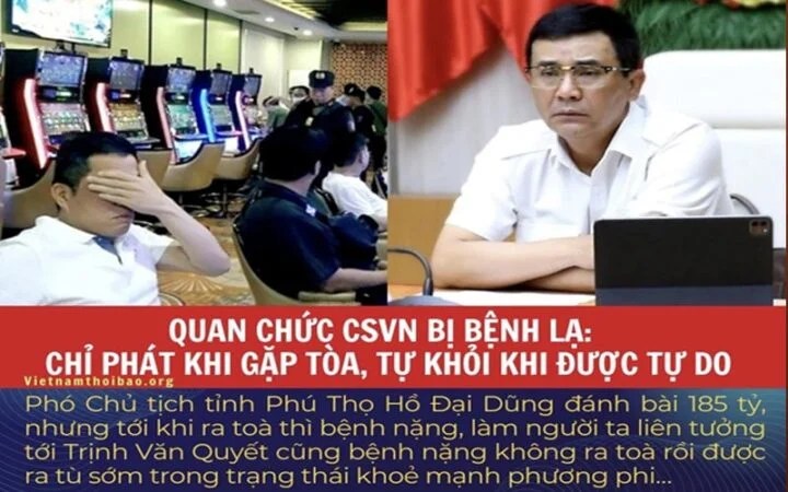 Phó Chủ tịch tỉnh Phú Thọ Hồ Đại Dũng đánh bài 185 tỷ, nhưng tới khi ra toà thì bệnh nặng, làm người ta liên tưởng tới Trịnh Văn Quyết cũng bệnh nặng không ra toà rồi được ra tù sớm trong trạng thái khoẻ mạnh phương phi…