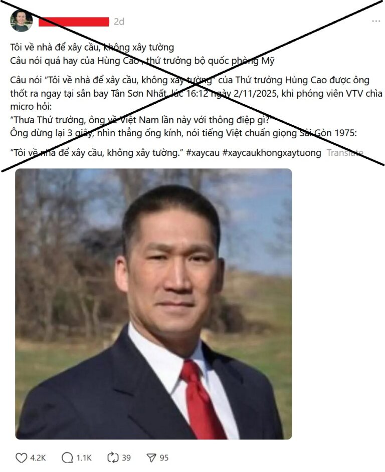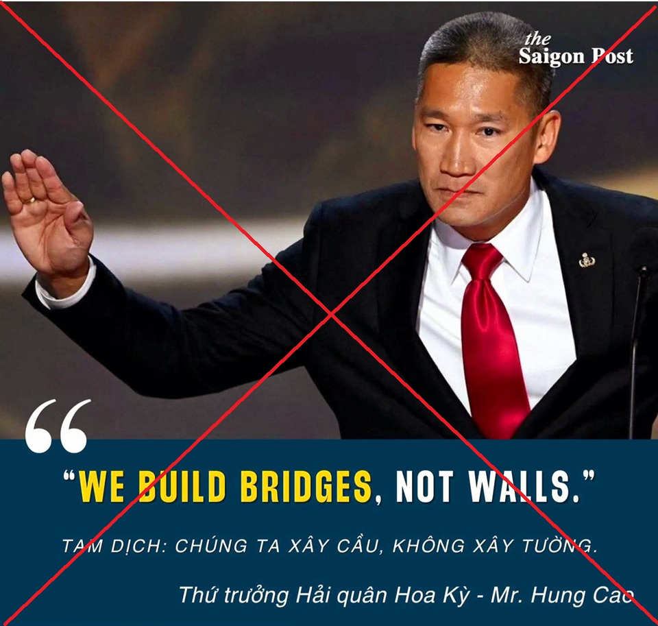 Mấy ngày qua, trên mạng xã hội xuất hiện nhiều thông tin không đúng sự thật về ông Hùng Cao, Thứ trưởng Hải quân Mỹ, nhất là thông tin cho rằng ông Hùng đã nói câu này khi đến thăm Việt Nam: “We build bridges, not walls“! (Chúng ta xây cây cầu, không xây tường). Một số Facebookers còn đi xa hơn khi nói rằng ông Hùng đang “tìm đường về nhà”, và rằng ông muốn khép lại “một trang sử”, một “quá khứ đau thương”.