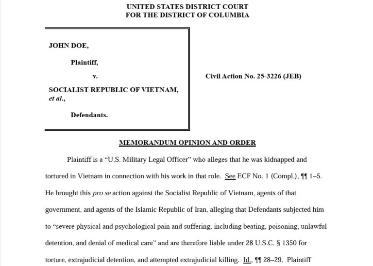 Hồ sơ vụ kiện (dân sự) mang số 1:25-cv-03226, được nguyên đơn “người tự nhận là sĩ quan pháp lý của quân đội Hoa kỳ” nộp tại Tòa án Quận Columbia (United States District Court District of Columbia) hồi cuối tháng 9, kiện đích danh TBT Tô Lâm, Nhà nước CHXHCNVN cùng với nhiều viên chức Việt Nam, theo danh sách đính kèm trong hình.