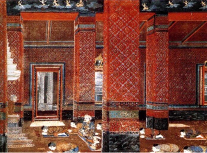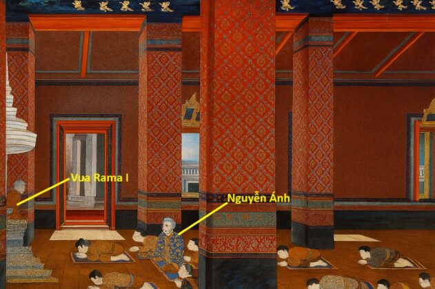Hình 1: Tranh vẽ Nguyễn Ánh (tiếng Thái: Ong Chiang Sue) khi ở Bangkok trong một buổi thiết triều của vua Rama I tại điện Amarin, Bangkok, năm 1782 (Ghi chú của công chúa Maha Chakri Sirindhorn).