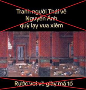 Hình 2: Trung tướng Nguyễn Thanh Tuấn lấy bức một bức tranh, được ai đó ghi chú: “Tranh người Thái vẽ Nguyễn Ánh quỳ lạy vua Xiêm. Rước voi về giày mả tổ“, để chứng minh cho quan điểm của mình rằng Nguyễn Ánh bán nước:
