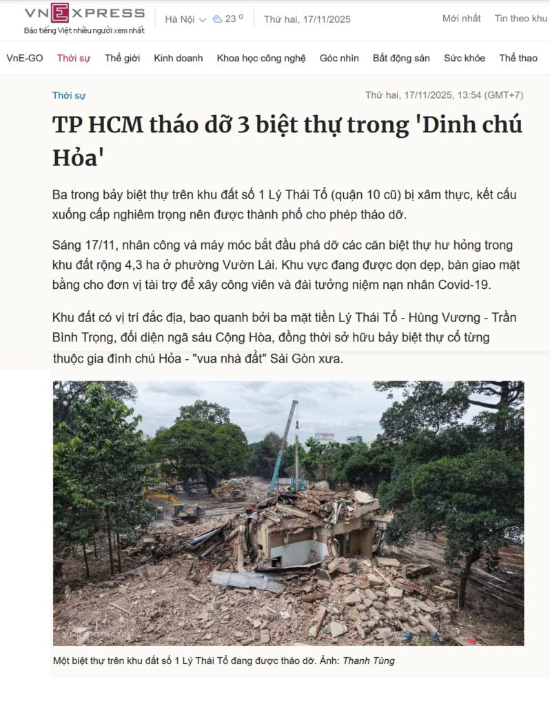 Đến 13:54p, trên Vnexpress đi bài “TP HCM tháo dỡ 3 biệt thự trong ‘Dinh chú Hỏa”. Đến 15:47p, Tuổi trẻ thông tin: “UBND TP.HCM: 3 trong 7 biệt thự cổ ở khu đất số 1 Lý Thái Tổ xuống cấp nặng, cần xử lý”.