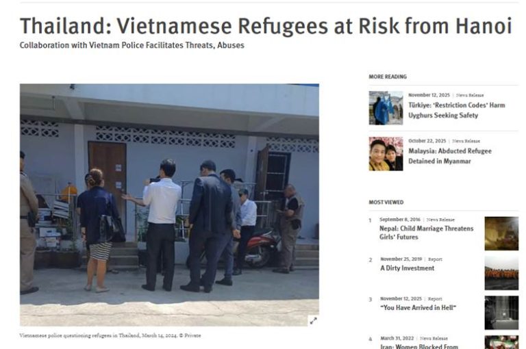 Tổ chức nhân quyền quốc tế Human Rights Watch (HRW) vừa công bố tài liệu về sự hợp tác ngày càng chặt chẽ của chính phủ Thái Lan với nhà nước Việt Nam để đàn áp xuyên quốc gia hàng loạt những người đang được Cao Ủy Tị Nạn LHQ bảo vệ. Xem: https://www.hrw.org/news/2025/11/13/thailand-vietnamese-refugees-at-risk-from-hanoi