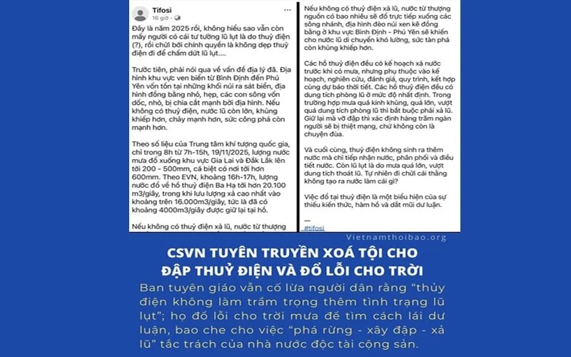 Mấy ngày nay người dân liên tục chỉ trích việc CSVN xả lũ tàn nhẫn như muốn giết dân. Lòng người đang bất mãn cao độ trước thảm họa do các đập thuỷ điện gây ra. Rất nhanh chóng, lực lượng tuyên giáo và dư luận viên CSVN lập tức tung chiến dịch chạy tội cho chuyện xả lũ vô tội vạ này,