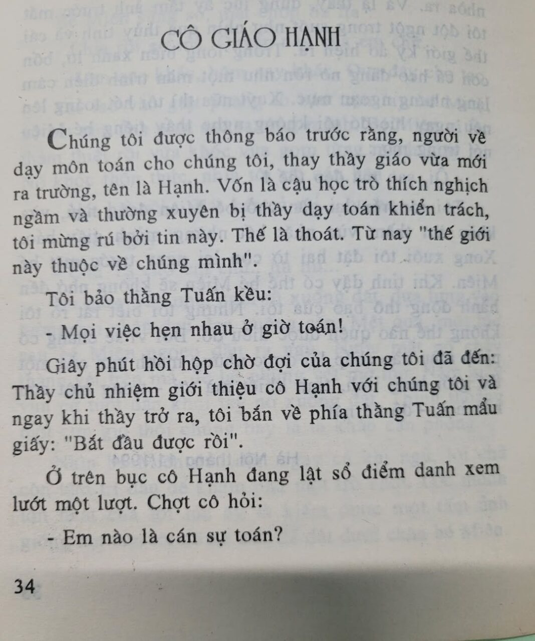 Một hôm như thế, đúng vào giờ học toán. Cô giáo dạy toán của chúng tôi tên là Hạnh, người Hà Nội, nghe nói con gái một vị luật sư lớn. Cô vẫn nổi tiếng là nghiêm khắc. Cô đặt ra những yêu cầu rất ngặt nghèo về tác phong cho học sinh. Ngồi trong lớp mà ngáp hay ho thì phải che tay lên miệng và tuyệt đối không được đội mũ, không được nói chuyện, không được gõ bàn… Nếu ai đó vi phạm cô sẽ mời bằng được ra ngoài, cho tới khi hết giờ của cô. Chỉ cần trong lớp có đứa nào đó không cài hết cúc áo khiến để hở ngực – điều cô rất ghét vì nó thiếu tôn trọng người khác theo lời cô – cô sẽ đứng bên ngoài lớp cho đến khi “sự cố” được khắc phục.