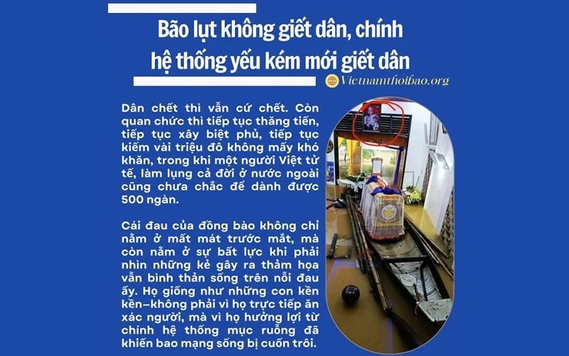 Cái đau của đồng bào không chỉ nằm ở mất mát trước mắt, mà còn nằm ở sự bất lực khi phải nhìn những kẻ gây ra thảm họa vẫn bình thản sống trên nỗi đau ấy. Họ giống như những con kền kền—không phải vì họ trực tiếp ăn xác người, mà vì họ hưởng lợi từ chính hệ thống mục ruỗng đã khiến bao mạng sống bị cuốn trôi.