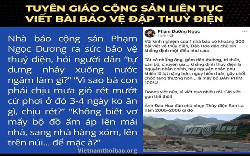 Nhà báo cộng sản Phạm Ngọc Dương ra sức bảo vệ thuỷ điện, hỏi người dân “tự dưng nhảy xuống nước ngâm làm gì?” . “Vì sao bà con phải chịu mưa gió rét mướt cứ phơi ở đó 3-4 ngày ko ăn gì, chịu rét?” . “Không biết vơ mấy bộ đồ ấm áp lên mái nhà, sang nhà hàng xóm, lên trên núi… để mặc à?”