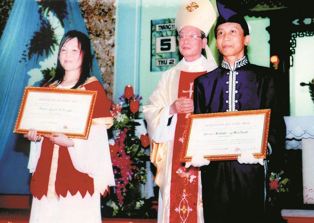 Hôm ấy, các linh mục chủ tịch Hội Đồng Giám Mục Việt Nam, chủ tịch Ủy Ban Giáo Lý Đức Tin và giám mục Giáo Phận Xuân Lộc được ủy quyền đại diện Đức Giáo Hoàng Benedict, công bố và trao sắc phong cùng các phẩm phục cho vợ chồng ông, cũng chỉ nói ngắn gọn rằng: “Anh chị đã có nhiều đóng góp vượt trội cho Giáo Hội, đất nước, cho cộng đồng và thế giới.”