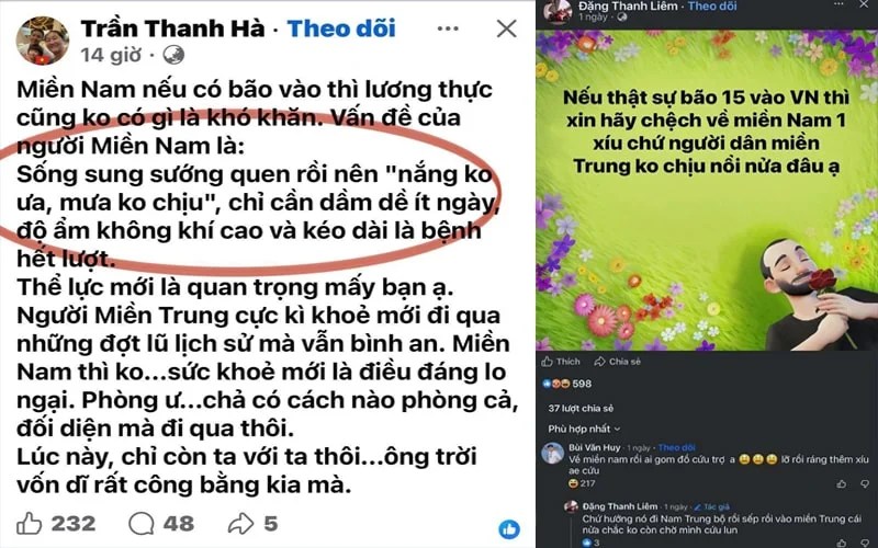 “Miền nào cũng là người trong nước Việt, mà chính cái miền Nam ấy là nơi luôn dốc lòng tương trợ khi miền Trung bị lũ lụt, thế mà nó muốn cầu xin cho tang hoang cả nước ư? Thật là cái não quá xá tệ….. !!!!!”, một facebooker bình luận trên mạng xã hội.