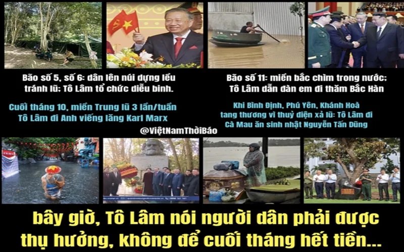 Bão số 5, số 6, Tô Lâm tổ chức diễu binh; bão số 11, Tô Lâm thăm Bắc Triều Tiên; cuối tháng 10, miền Trung lũ 3 lần/tuần, Tô Lâm đi Anh viếng lăng Karl Marx; khi Bình Định, Phú Yên, Khánh Hoà tang thương vì thuỷ điện xả lũ: Tô Lâm đi Cà Mau ăn sinh nhật Nguyễn Tấn Dũng; bây giờ, Tô Lâm nói người dân phải được thụ hưởng, không để cuối tháng hết tiền…