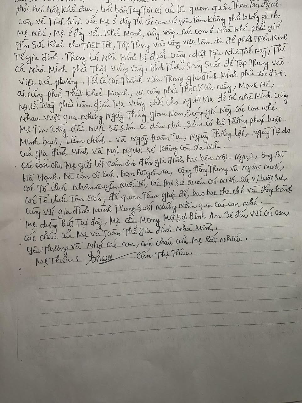 Mẹ dừng bút tại đây. Mẹ cầu mong sự bình an sẽ đến với các con, các cháu của mẹ và toàn thể gia đình. Yêu thương và nhớ các con, các cháu của mẹ rất nhiều.