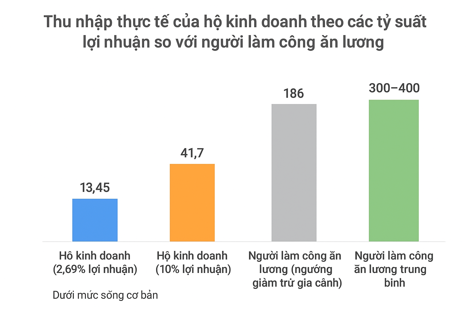 Ngay cả khi áp dụng một kịch bản lạc quan phi thực tế là lợi nhuận 10%, thu nhập cũng chỉ đạt 4,17 triệu đồng/tháng. Trong khi đó, mức sống tối thiểu của một hộ gia đình 4 người ở các tỉnh thành vừa phải cũng dao động từ 4-6 triệu đồng/người/tháng, chưa kể chi phí học hành, y tế, điện nước, xăng dầu và tái đầu tư vào kinh doanh. Như vậy, mức thu nhập thực tế của hộ kinh doanh vẫn nằm dưới ngưỡng sống cơ bản, chứ chưa nói đến việc tích lũy hay mở rộng sản xuất.
