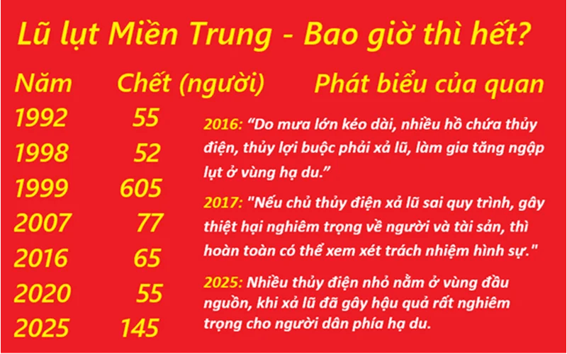 Người dân nhiều tỉnh miền Trung đã trải qua trận lũ lụt kinh hoàng, gần như mỗi năm miền Trung đều tái diễn bi kịch: bão lũ ảnh hưởng đến sinh mạng, tài sản mất mát, sinh kể bị nhấn chìm theo dòng nước. Bao giờ cái vòng lặp này mới thật sự chấm dứt?