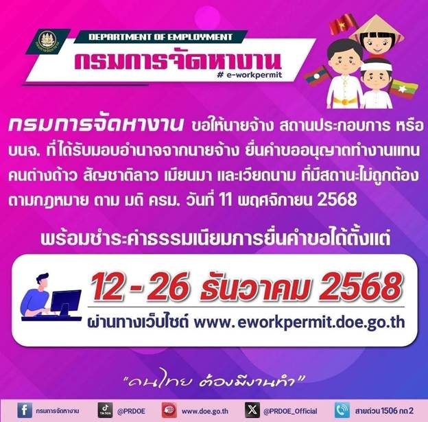 Ngày 12 tháng 12 vừa qua, Bộ Lao Động Thái Lan mở lại chương trình cấp giấy phép lao động (thẻ hồng) cho công dân Miến Điện, Lào và Việt Nam. Thời hạn chót để nộp đơn là 26 tháng 12.
