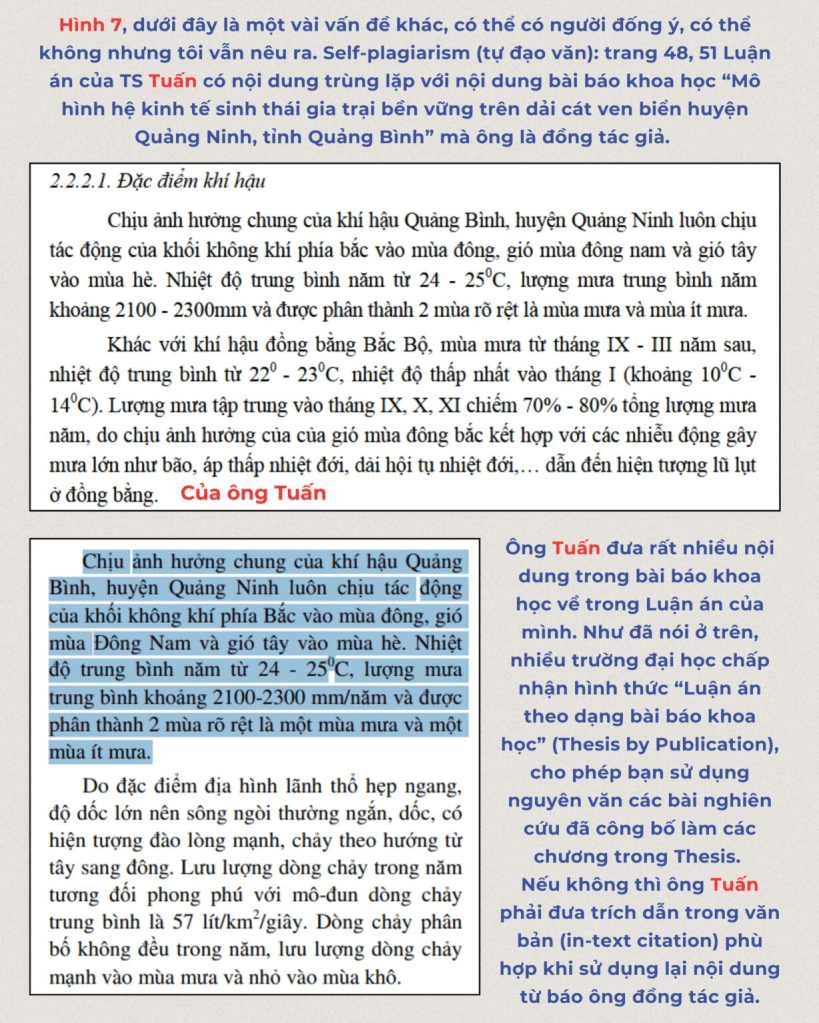 Hình 7: Một vấn đề khác cần được nêu ra, dù có người đọc ở đây có thể đồng ý hoặc không đồng ý, là hiện tượng tự đạo văn. Trang 48 và 51 của Luận án Tiến sĩ ông Trần Anh Tuấn có nội dung trùng lặp với bài báo khoa học “Mô hình hệ kinh tế sinh thái gia trại bền vững trên dải cát ven biển huyện Quảng Ninh, tỉnh Quảng Bình”, trong đó ông là đồng tác giả.