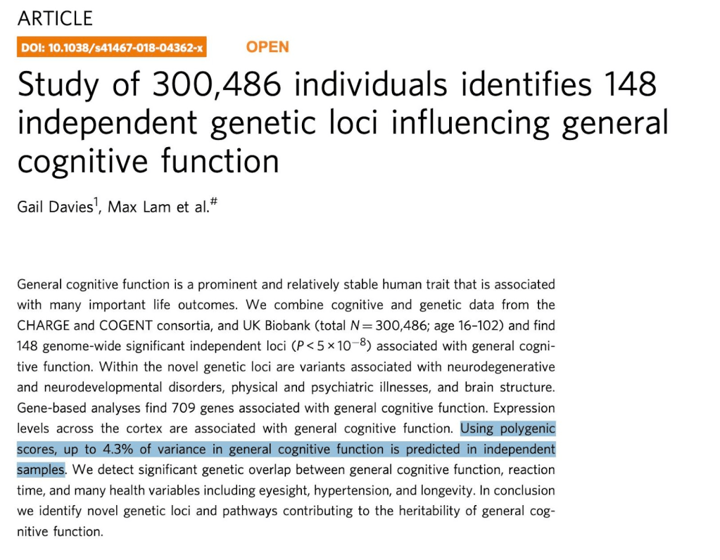 Bằng chứng rõ ràng rằng gene chỉ giải thích một phần nhỏ sự khác biệt về trí thông minh. Môi trường và giáo dục mới là yếu tố quyết định. Thành ra, việc ưu tiên di truyền sẽ dẫn đến bất bình đẳng ghê gớm, kỳ thị cá nhân và lãng phí nguồn lực.