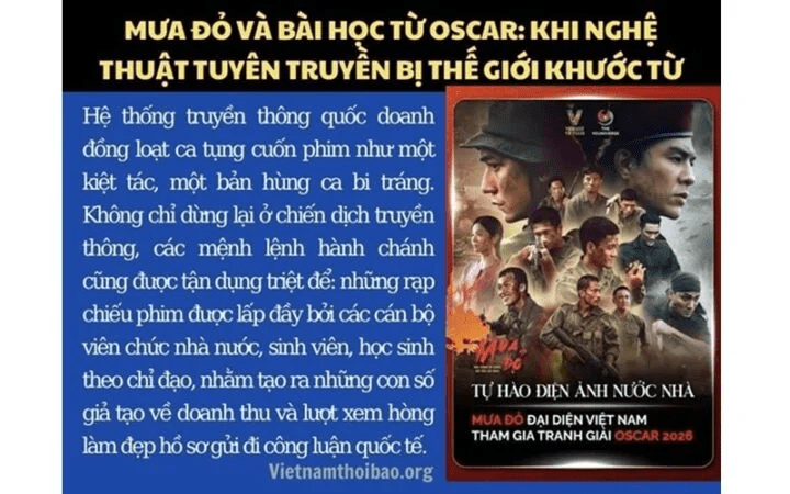 Sự kiện cuốn phim Mưa Đỏ bị loại khỏi danh sách rút gọn (Shortlist) của giải Oscar hạng mục Phim Truyện Quốc Tế không chỉ là một thất bại ê chề về mặt nghệ thuật. Mà còn là một chỉ dấu rõ ràng cho thấy thái độ của thế giới tự do đối với những sản phẩm văn hóa vận mang nặng tính nhồi sọ của nhà cầm quyền Hà Nội.