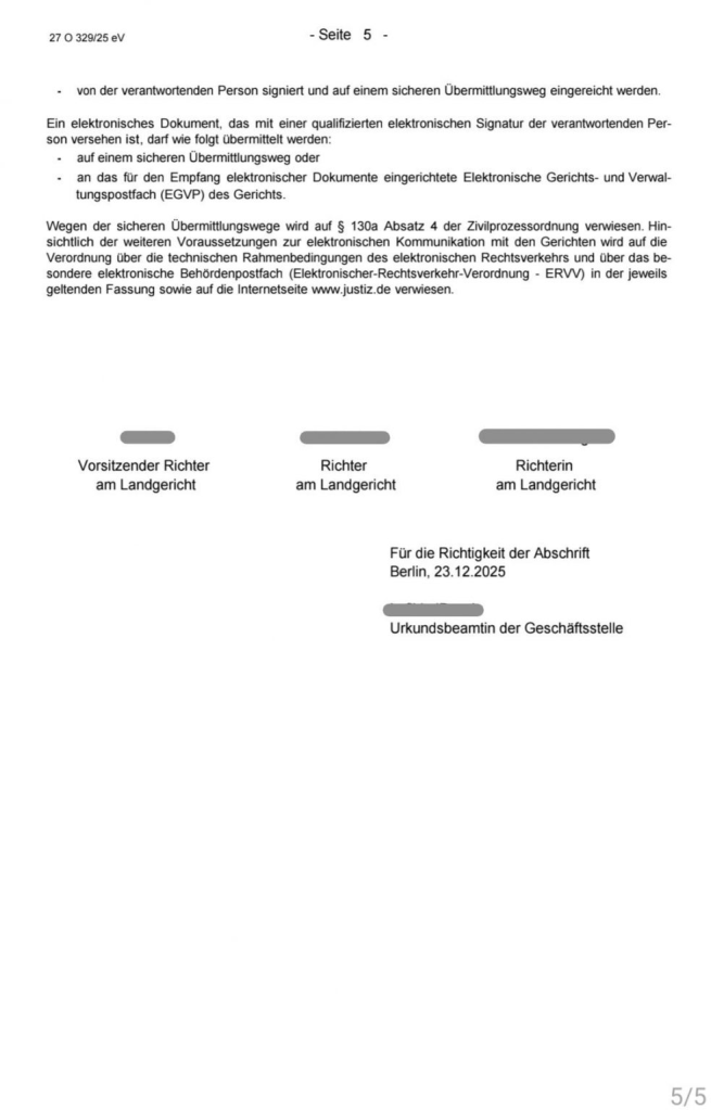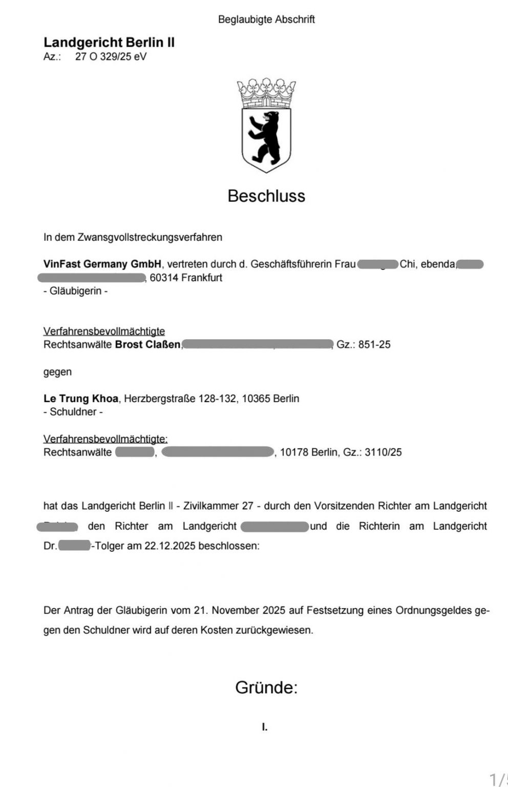 Ngày 22-12 -2025, Tòa án Dân sự bang Berlin II đã ra phán quyết: