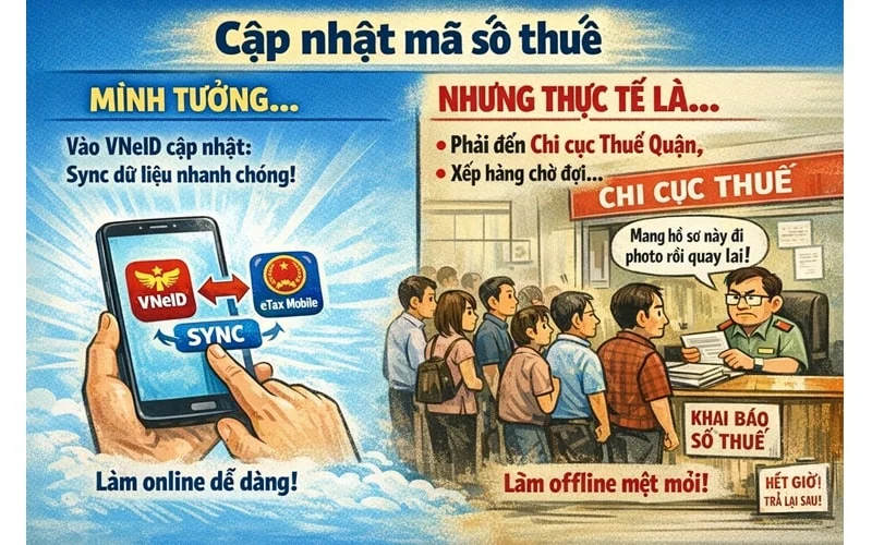 Ví dụ, mình đổi bằng lái xe, bằng mới nó phọt lên VNeTraffice của bên CSGT sau 3 ngày xong thủ tục, thế là OK. Nhưng bấm nút cập nhật sang bên VNeID thì nửa tháng chưa thấy sang, vẫn hiển thị bằng cũ đã hết hạn. Dù dữ liệu trong ngành CA cả đó. Bên VNeID cũng có khai người phụ thuộc. Mình khai offline bên thuế, nó đã lên eTax Mobille sau 1 tuần. Nhưng bên VNeID không cập nhật, vẫn không chấp nhận thằng lớn! Dù mình đã khai lại sau khi bên kia đã cập nhật, vẫn không chấp nhận.